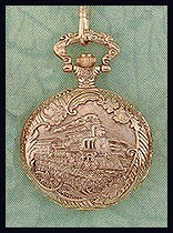 9835-"Railroad" style pocket watch with an embossed gold train. Matching fob chain.
