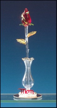 28205-Delicate glass, "Mom" vase holds a solid glass rose. Accents of gold plating